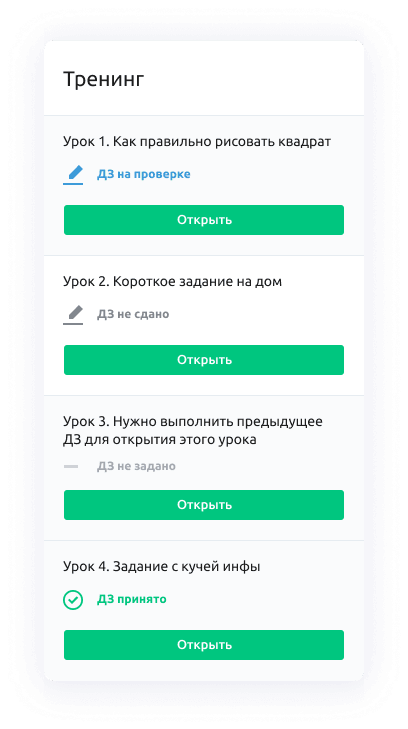Проверяйте задания сами, привлеките кураторов или включите авто-проверку. Увеличьте разнообразие, принимая от учеников файлы с ДЗ (Фото / Word / Excel / PowerPoint / PDF). Доступна запись Аудиосообщений.